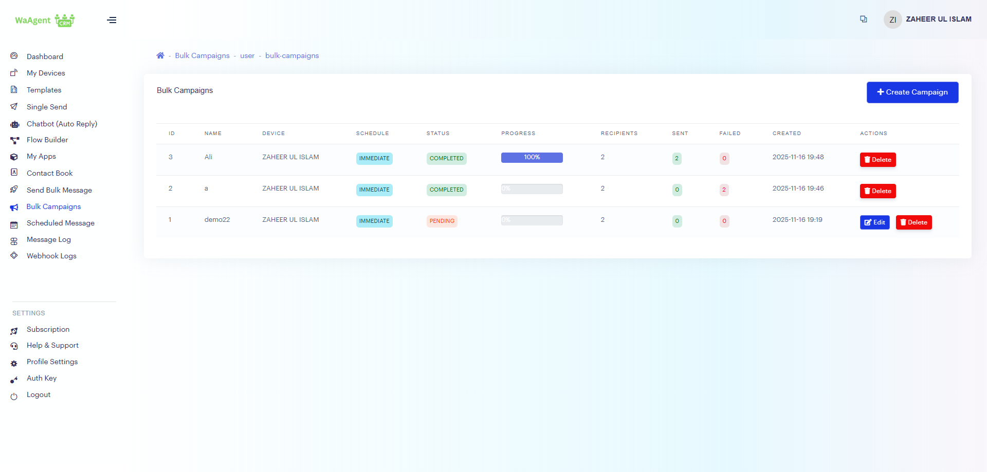 {{name}},{{phone}},{{param1}},{{param2}}for personalized messaging - Campaign Management – Edit, pause, resume, and delete campaigns with real-time progress tracking